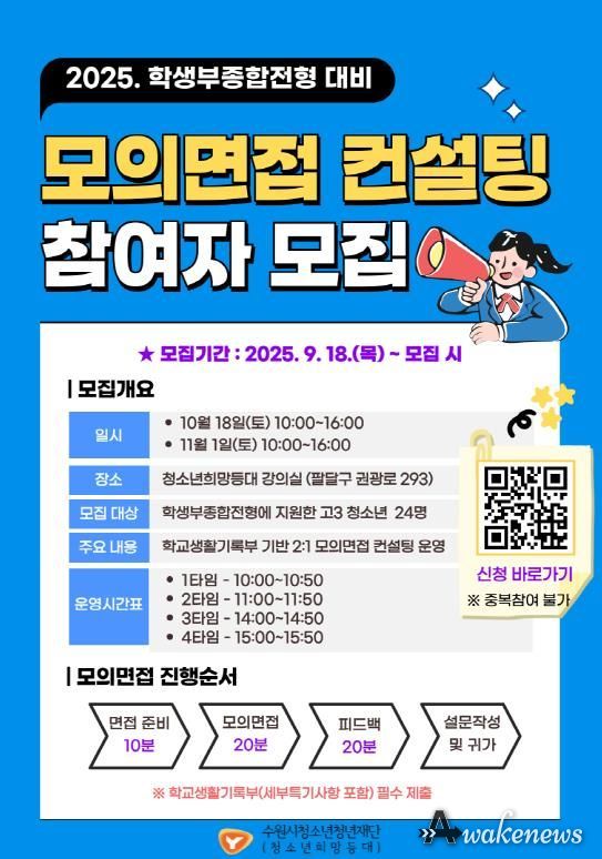 어웨이크뉴스 오경하 기자 | 수원시청소년청년재단 청소년희망등대는 2026학년도 대학입시를 준비하는 청소년들을 대상으로 ‘학생부종합전형 모의면접 컨설팅’ 프로그램을 운영하며, 9월 18일부터 참가자를 모집중이다.