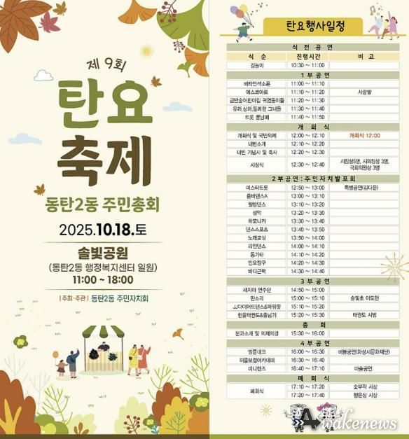 어웨이크뉴스 오경하 기자 | 화성특례시 동탄2동 주민자치회는 오는 18일 솔빛공원 일원에서 ‘동탄2동 제9회 탄요축제’ 및 ‘2025년 동탄2동 주민총회’를 개최한다.