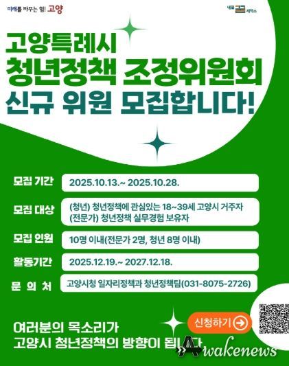 어웨이크뉴스 오경하 기자 | 고양특례시는 청년이 시정의 주체로 참여해 정책을 함께 만들어갈 수 있도록 고양시 청년정책조정위원회 청년 및 전문가 위원을 공개 모집한다고 밝혔다.