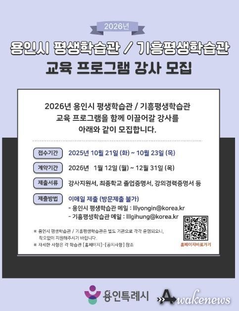 어웨이크뉴스 오경하 기자 | 용인특례시는 21일부터 23일까지 3일간 ‘2026년 평생학습관 프로그램’을 운영할 강사를 모집한다고 15일 밝혔다.