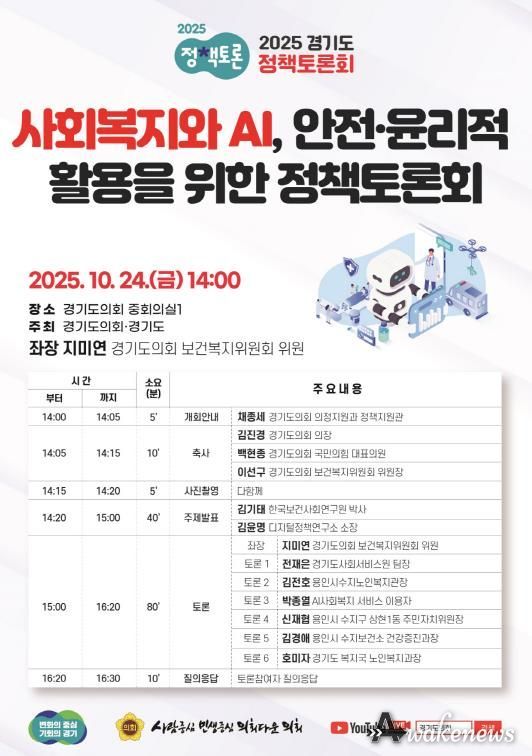 행사는 경기도의회, 경기도가 공동 주최하며, 지미연 의원이 좌장을 맡아 진행한다. 이날 행사에는 학계, 공공기관, 보건의료 분야, 주민 대표, 경기도 담당부서 등 다양한 분야의 전문가들이 참석해 사회복지 영역에서의 AI 기술 안전 활용 방안과 제도적 개선 방향을 논의할 예정이다.
