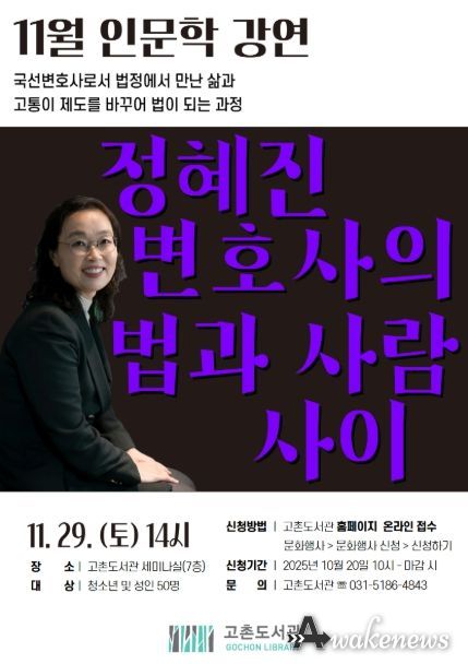어웨이크뉴스 오경하 기자 | 김포시 고촌도서관은 오는 11월 29일 오후 2시부터 4시까지 '법과 사람 사이' 강연을 운영한다.