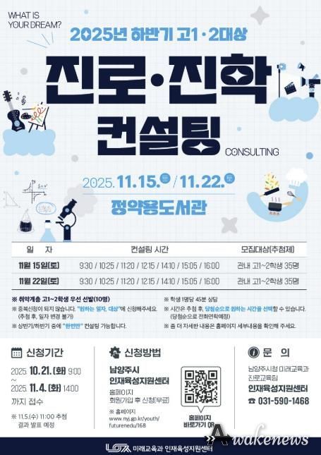 어웨이크뉴스 오경하 기자 | 남양주시는 오는 21일부터 ‘2025년 하반기 진로·진학 컨설팅’참가자를 모집한다고 밝혔다.