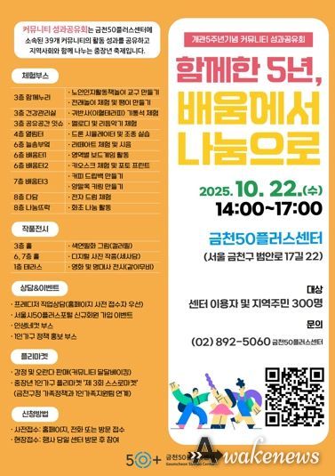 어웨이크뉴스 오경하 기자 | 금천구는 22일 오전 11시부터 오후 5시까지 금천50플러스센터 주최로 ‘개관 5주년 기념 커뮤니티 성과공유회’를 연다고 밝혔다.