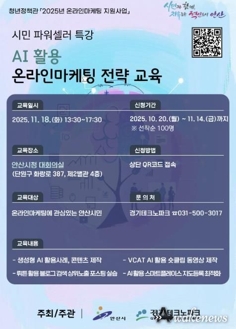 어웨이크뉴스 오경하 기자 | 안산시는 다음 달 14일까지 생성형 인공지능(AI)을 활용한 온라인 마케팅 역량 강화 ‘시민 파워셀러’ 6회차 교육생을 모집한다고 20일 밝혔다.