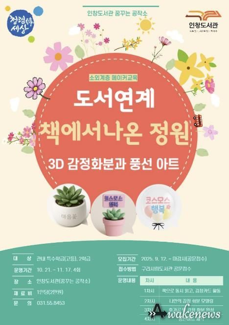 어웨이크뉴스 오경하 기자 | 구리시 인창도서관의 메이커스페이스‘꿈꾸는 공작소’가 오는 10월 21일부터 11월 17일까지 총 4회에 걸쳐 특수학급 학생들을 대상으로 '책에서 나온 정원' 메이커 프로그램을 운영한다.