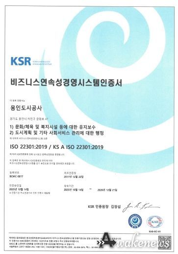 어웨이크뉴스 오경하 기자 | 용인도시공사는 지난 9월 29일부터 30일까지 진행된 ISO45001(안전보건경영시스템) 갱신심사 및 ISO22301(비즈니스연속성경영시스템) 사후관리심사에서 모두 ‘적합’ 판정을 받으며, 국제표준에 부합하는 안전관리체계를 지속적으로 유지하고 있음을 다시 한번 입증했다.