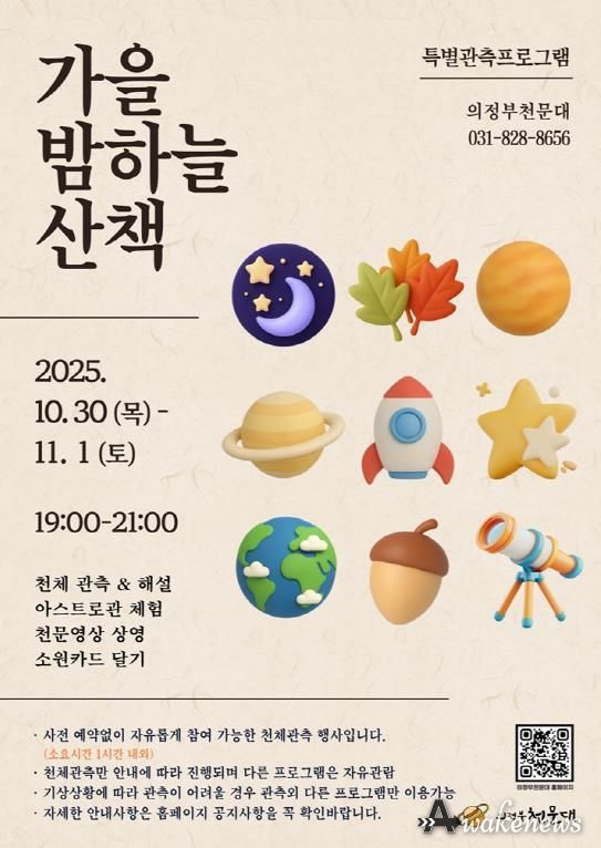 어웨이크뉴스 오경하 기자 | 의정부과학도서관은 10월 30일부터 11월 1일까지 의정부천문대에서 특별 관측 행사 ‘가을 밤하늘 산책’을 운영한다.