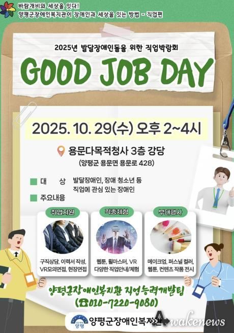 어웨이크뉴스 오경하 기자 | 대한불교조계종사회복지재단이 운영하는 양평군장애인복지관은 오는 29일 오후 2시부터 4시까지 용문다목적청사 3층 강당에서 발달장애인의 직업 탐색 기회를 지원하기 위한 직업박람회 ‘GOOD JOB DAY’를 개최한다.