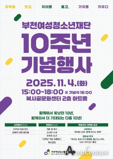 어웨이크뉴스 오경하 기자 | 부천여성청소년재단은 11월 4일 오후 3시부터 복사골문화센터 2층 아트홀에서 설립 10주년 기념행사를 개최한다. 이번 행사는 지난 10년간의 발자취를 돌아보고, 시민과 함께 만들어갈 다음 10년을 그려보기 위해 마련됐다.