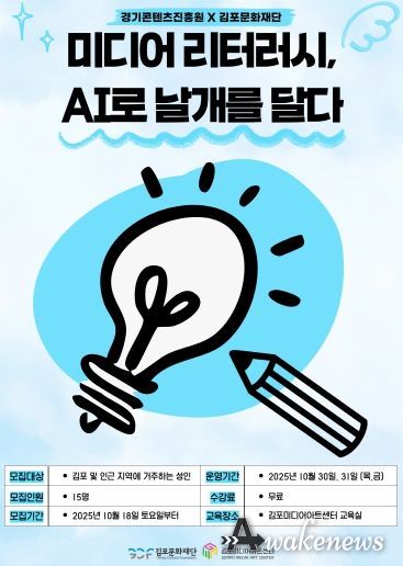 어웨이크뉴스 오경하 기자 | (재)김포문화재단과 경기콘텐츠진흥원은 오는 10월 30일과 31일, 양일간 김포미디어아트센터 교육실에서 '미디어리터러시, AI로 날개를 달다' 디지털 리터러시 및 AI 활용 교육을 공동 개최한다고 밝혔다.