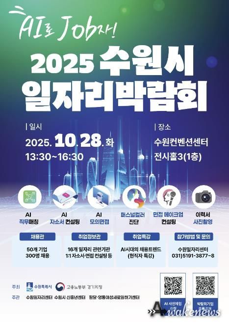 어웨이크뉴스 오경하 기자 | 수원특례시와 고용노동부 경기지청은 10월 28일 오후 1시 30분부터 4시 30분까지 수원컨벤션센터 전시홀에서 ‘AI로 JOB자-2025 수원시 일자리박람회’를 개최한다.