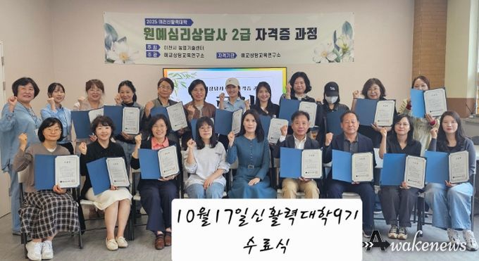 어웨이크뉴스 오경하 기자 | 이천시 농업기술센터가 주최하고 예교상담교육연구소가 주관한 ‘이천신활력대학 제9기 원예심리상담사 2급 자격증 과정’이 지난 10월 17일, 이천신활력대학 교육장에서 수료식을 열고 8주간의 교육 일정을 성공적으로 마무리했다.