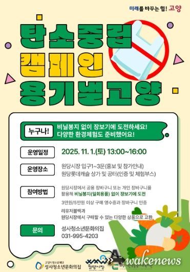 어웨이크뉴스 오경하 기자 | 고양청소년재단 성사청소년문화의집은 오는 11월 1일 원당시장에서 청소년 주도의 온실가스 감축 실천활동 ‘용기 낼 고양’을 운영한다고 밝혔다.