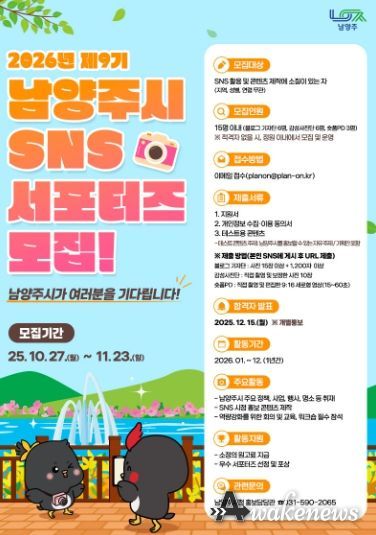 어웨이크뉴스 오경하 기자 | 남양주시는 시민이 직접 참여해 시정 소식을 전달하는 ‘2026년 남양주시 SNS 서포터즈’를 오는 11월 23일까지 모집한다.