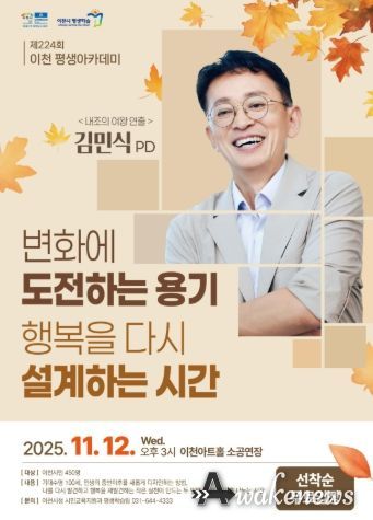 어웨이크뉴스 오경하 기자 | 이천시는 오는 11월 12일 오후 3시, 이천아트홀 소공연장에서 제224회 이천평생아카데미를 개최한다. 이번 아카데미에는 MBC 드라마 프로듀서(PD) 출신이자 저널리즘 교수로 활동 중인 김민식 교수를 초청해 ‘변화에 도전하는 용기, 행복을 다시 설계하는 시간’이라는 주제로 특별 강연을 진행한다.