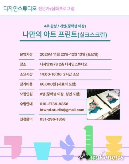 어웨이크뉴스 오경하 기자 | 경기문화재단 경기상상캠퍼스는 2025년 디자인스튜디오 판화 집중 교육 프로그램으로 청소년·성인 대상의 〈나만의 아트 프린트〉와 초등학생 대상의 〈핸드 프린트 입문〉 강좌 수강생을 모집한다. 이번 교육은 경기문화재단이 추진하는 ‘생활 속 디자인 감수성 확장’ 사업의 일환으로, 도민이 일상에서 예술적 경험을 쌓을 수 있도록 기획됐다. 11월부터 12월까지 진행되는 이번 프로그램은 디자인스튜디오에서 처음 시도되는 판화 심화 교육 과정으로, 실크스크린과 핸드 프린트 두 가지 프로그램을 통해 판화 예술의 매력을 직접 체험할 수 있다.