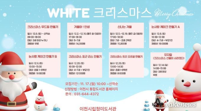 어웨이크뉴스 오경하 기자 | 이천시 청미도서관이 다가오는 크리스마스를 맞아 가족이 함께 즐길 수 있는 다채로운 겨울 프로그램을 운영한다. 이번 프로그램은 유아부터 가족 단위 이용자까지 모두가 참여할 수 있도록 구성되어, 따뜻하고 포근한 겨울 감성 속에서 즐겁고 뜻깊은 경험을 선사할 예정이다.