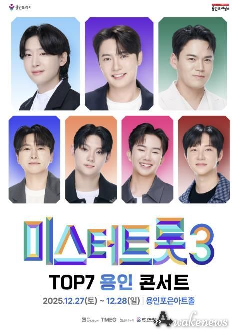 어웨이크뉴스 오경하 기자 | 용인문화재단은 오는 12월 27일부터 28일까지 용인포은아트홀에서 ‘미스터트롯3 TOP7 콘서트’를 선보인다. 공연은 27일 오후 1시·6시, 28일 오후 1시 총 3회 진행된다.