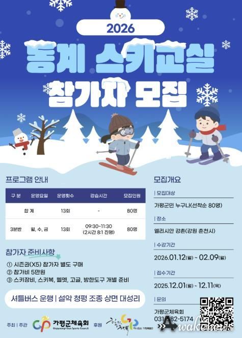 어웨이크뉴스 오경하 기자 | 가평군체육회가 주최하고 가평군이 후원하는 ‘2026 동계스포츠 스키교실’에서 참여인원 80명을 선착순으로 모집한다.