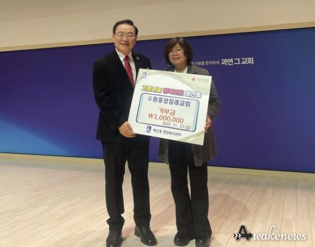 어웨이크뉴스 오경하 기자 | 수원중앙침례교회가 지난 23일, 지역 내 어려운 이웃을 돕기 위해 매산동 지역사회보장협의체 사회복지공동모금회 계좌로 성금 100만 원을 기탁했다.