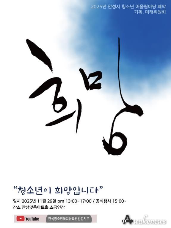 어웨이크뉴스 오경하 기자 | 안성시는 오는 11월 29일, 안성맞춤아트홀 소공연장에서 2025 안성시 청소년 어울림마당 폐막식 ‘희망’을 개최한다.