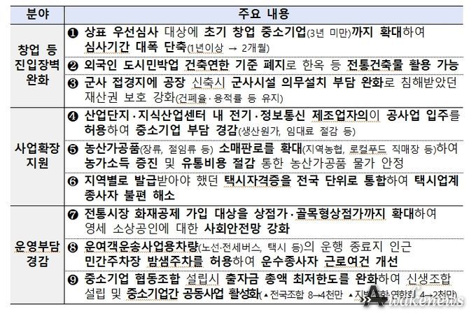 이번 방안은 경기 회복의 흐름이 민생현장의 지속가능한 성장과 도약으로 이어지도록, 중소기업과 소상공인이 사업운영 전반에서 체감하는 불합리한 규제애로를 선제적으로 개선하기 위해 마련됐다.