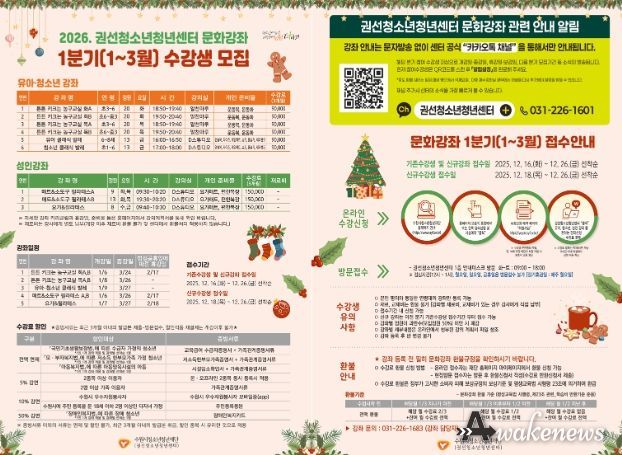 어웨이크뉴스 오경하 기자 | 수원시청소년청년재단 권선청소년청년센터는 오는 1월 6일부터 3월 27일까지 지역사회 평생학습 문화강좌 1분기(1~3월) 수강생을 모집한다.