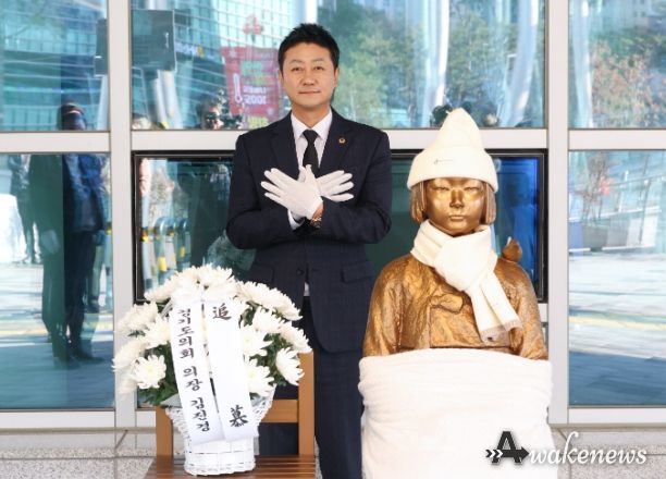 어웨이크뉴스 오경하 기자 | 김진경 경기도의회 의장(더민주, 시흥3)은 12일 오전 도의회 1층 입구에서 열린 ‘평화의 소녀상’ 7주년 추모식에 참석해 피해자들의 희생을 기렸다.