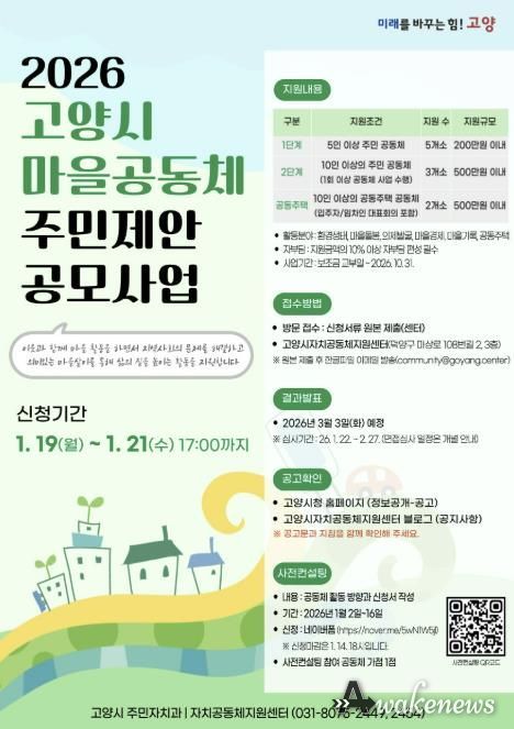 어웨이크뉴스 오경하 기자 | 고양특례시는 이웃과 함께 마을 활동에 참여하며 주민 스스로 지역 문제를 해결해 나가는 ‘2026년 고양시 마을공동체 주민제안 공모사업’에 참여할 공동체를 내년 1월 19일부터 모집한다고 밝혔다.