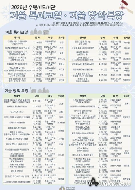 수원시도서관 관계자는 “겨울방학 동안 아이들이 책과 가까워지고 다양한 경험을 쌓을 수 있도록 프로그램을 준비했다”며 “도서관이 배움과 휴식이 공존하는 공간이 되길 바란다”고 말했다.
