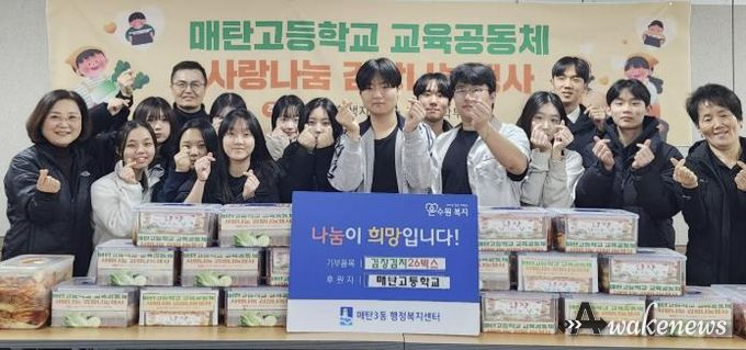 어웨이크뉴스 오경하 기자 | 매탄고등학교는 지난 19일, 교사·학생·학부모가 함께 참여해 마련한 김장김치 26박스를 매탄3동행정복지센터에 전달하며 지역사회에 따뜻한 나눔을 실천했다.