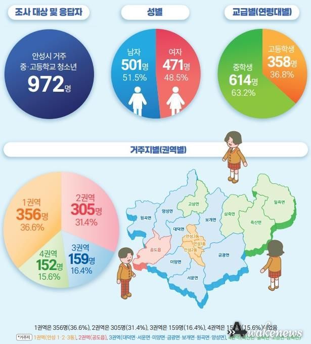 어웨이크뉴스 오경하 기자 | 안성시청소년수련관은 지난 9월 안성시에 거주하는 중‧고등학생 청소년 972명을 대상으로'2025년 안성시 청소년 실태조사'설문조사를 실시하고, 그 결과를 발표했다. 이번 조사는 안성시 청소년의 생활 실태에 대한 객관적 자료를 축적해 체계적인 청소년 정책 수립의 기초자료로 활용하고, 청소년 요구에 부합하는 프로그램 개발을 통해 시설 이용률을 높이고자 추진됐다.