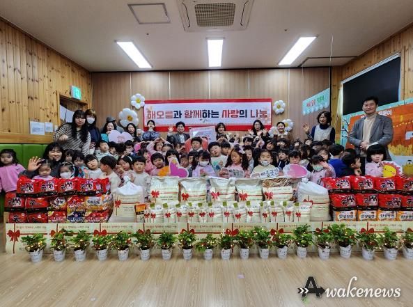 어웨이크뉴스 오경하 기자 | 오산시 대원2동 소재 해오름어린이집 교직원과 원아들은 지난 22일, 지역사회를 위한 나눔 활동의 일환으로 라면 280봉지와 쌀 104kg을 마련해 대원2동에 기탁했다.