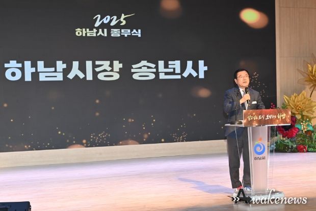 어웨이크뉴스 오경하 기자 | 하남시는 31일 시청 대강당에서 전 직원이 참석한 가운데 2025년 종무식을 개최하고, 한 해 동안의 성과를 돌아보며 2026년 시정 운영 방향을 공유했다. 이날 종무식은 2025년 시정 주요 성과를 담은 영상 상영을 시작으로, 시장 송년사, K-pop 댄스 챌린지 공연, 유공자 표창 수여 순으로 진행됐다.