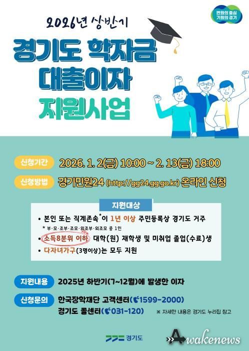 어웨이크뉴스 오경하 기자 | 경기도가 오는 2월 13일까지 ‘2026년 상반기 경기도 대학생 학자금 대출이자 지원사업’ 신청자를 접수한다.