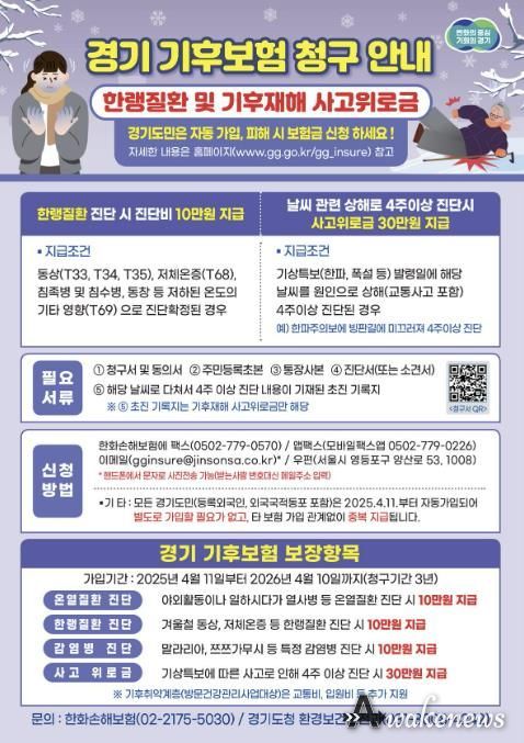 한편 ‘경기 기후보험’은 한랭질환 외에도 여름철 온열질환이나 말라리아, 쯔쯔가무시와 같은 특정 감염병 진단 시에도 각각 10만 원의 진단비를 지원한다. 상세한 문의는 한화손해보험(02-2175-5030)을 통해 가능하다.