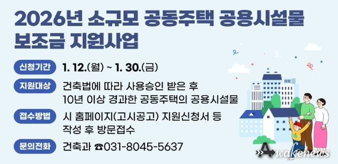 어웨이크뉴스 오경하 기자 | 안양시가 안전하고 쾌적한 주거환경 조성을 위해 ‘2026년 소규모 공동주택 공용시설물 보조금 지원사업’을 추진한다고 12일 밝혔다.