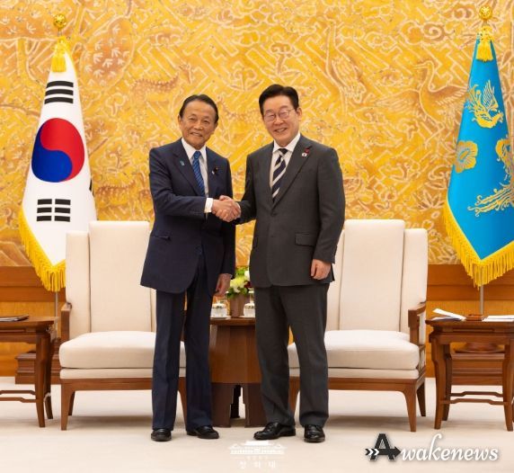 어웨이크뉴스 오경하 기자 | 이재명 대통령은 16일 16시부터 약 30분간 '서울-도쿄 포럼' 참석차 방한한 아소 다로(麻生 太郎) 전 일본 총리를 접견하고, 이번 주 진행된 나라(奈良) 방문(1.13.-14.)과 한일 정상회담 결과 등에 대해 이야기를 나누었다.