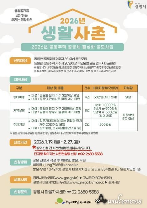 시는 공동주택 이웃 간 관계 회복과 생활권 중심 공동체 문화 확산을 위해 ‘2026년 광명시 생활사촌 공동주택 공동체 활성화 공모사업’ 참여자를 오는 2월 27일까지 모집한다.