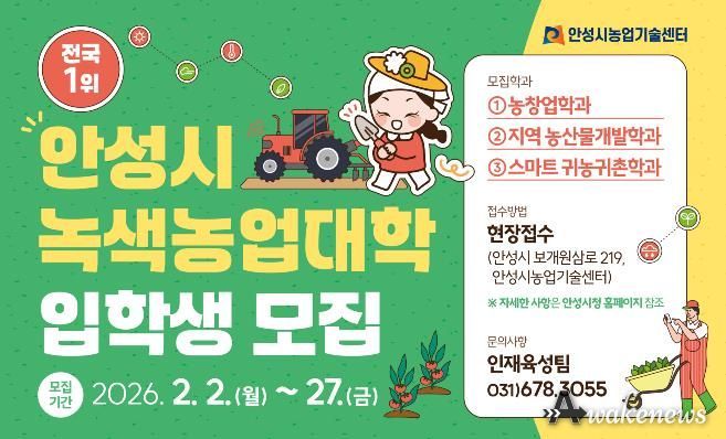 어웨이크뉴스 오경하 기자 | 안성시농업기술센터는 2월 2일부터 27일까지 ‘2026년도 녹색농업대학’ 교육생 60명을 모집한다.