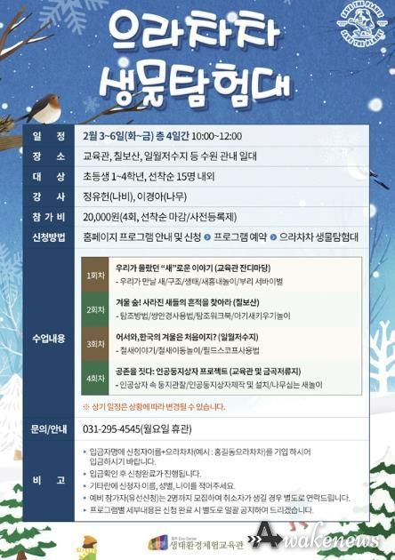 어웨이크뉴스 오경하 기자 | 칠보생태환경체험교육관이 겨울방학 프로그램 ‘으라차차 생물탐험대(겨울 탐조프로젝트)’에 참여할 초등학교 1~4학년 어린이 15명을 선착순으로 모집한다.