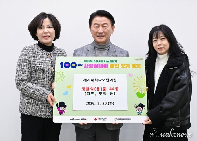 어웨이크뉴스 오경하 기자 | 의정부시는 1월 20일 새시대하나어린이집이 ‘100일간 사랑릴레이 배턴 잇기’에 동참해 관내 저소득층을 위한 생활식(용)품 44종(라면, 핫팩 등)을 기부했다고 밝혔다.