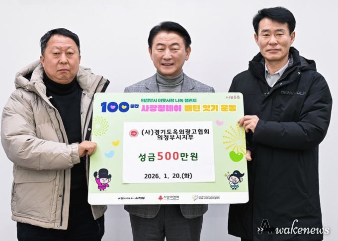 어웨이크뉴스 오경하 기자 | 의정부시는 1월 20일 (사)경기도옥외광고협회 의정부시지부가 ‘100일간 사랑릴레이 배턴 잇기’에 동참해 성금 500만 원을 기탁했다고 밝혔다.