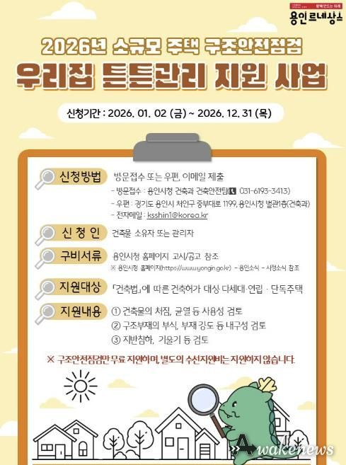 어웨이크뉴스 오경하 기자 | 용인특례시는 지역내 다세대와 연립, 단독주택 등 소규모 주택의 정밀 구조 안전점검을 무상으로 지원한다고 21일 밝혔다.