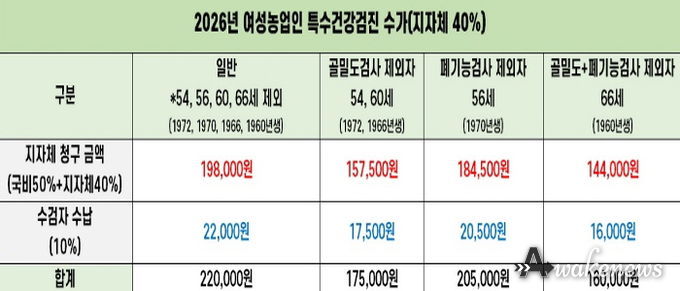 검진 항목은 근골격계‧심혈관계 질환, 농약중독 검사 등 여성농어업인에게 취약한 질환 중심으로 구성된다. 건강 상태에 따라 질환 예방을 위한 상담도 함께 제공한다.