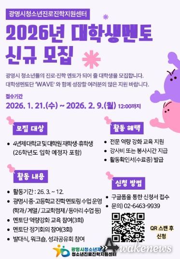 어웨이크뉴스 오경하 기자 | 광명시청소년재단 청소년진로진학지원센터는 관내 중·고등학교 청소년 대상 학과 멘토링 운영을 위해 ‘2026년 대학생 멘토단(wave)’을 모집한다고 밝혔다.