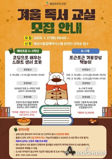 어웨이크뉴스 오경하 기자 | 화성시문화관광재단 봉담와우도서관은 겨울방학을 맞아 지역 아동과 유아를 대상으로 한 독서문화 프로그램인 ‘겨울 독서교실’을 2월 10일부터 13일까지 운영한다고 밝혔다.