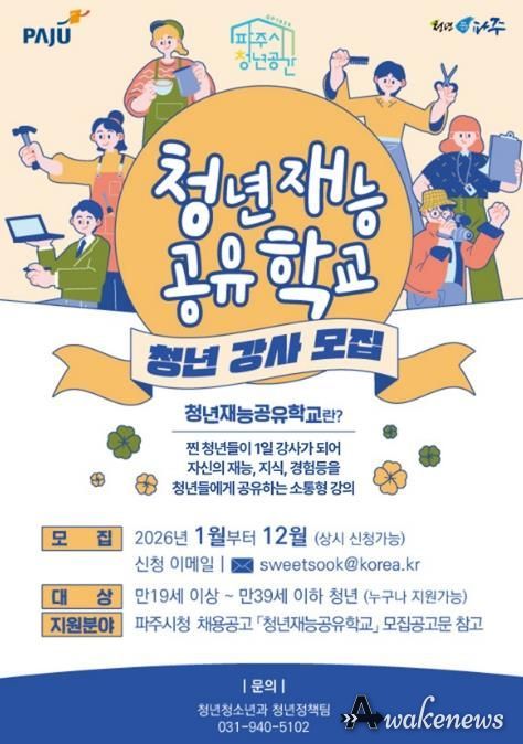 어웨이크뉴스 오경하 기자 | 파주시는 2026년 1월부터 12월까지 청년을 대상으로 '청년재능공유학교' 청년강사를 연중 상시 모집한다.