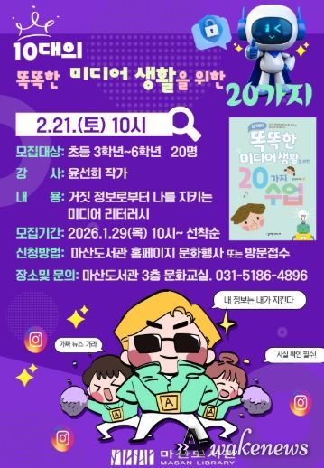 어웨이크뉴스 오경하 기자 | 김포시 마산도서관은 오는 2월 21일 오전 10시, 초등 3학년~6학년을 대상으로 어린이 프로그램 '10대의 똑똑한 미디어 생활을 위한 20가지'를 운영한다.